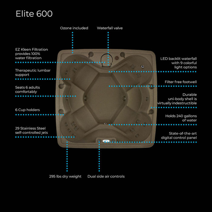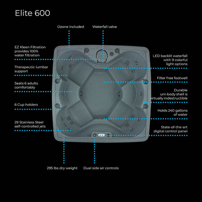 The Elite 600 Spa, with 29 Stainless Steel hydrotherapy jets, is packed with features that will make it hard for you to leave your backyard relaxation oasis! You can relax knowing your spa is using less energy with full foam insulation and ASTM certified locking safety to deliver optimum efficiency.