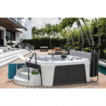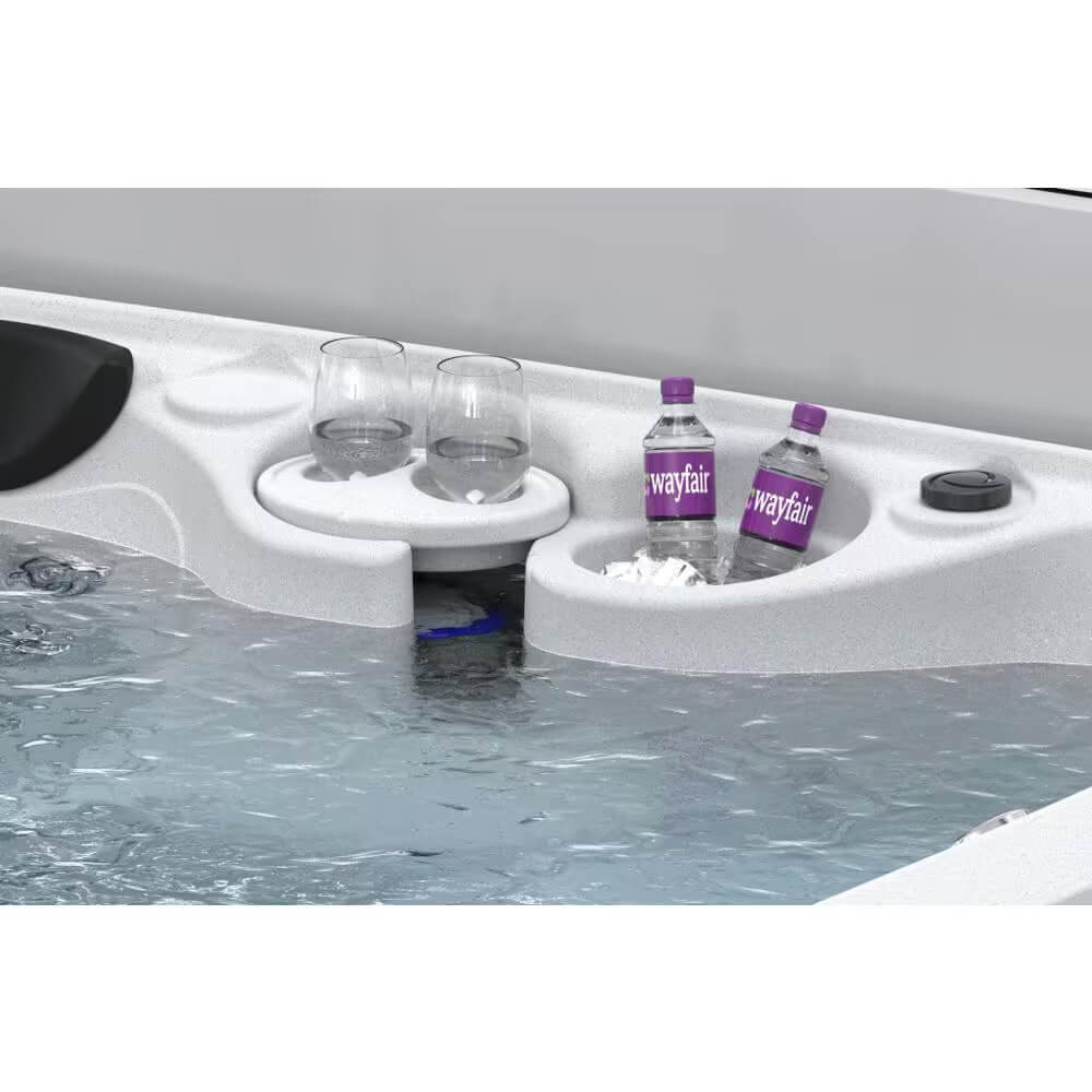 It’s more than a spa. It’s an Ensemble. The DayDream Ensemble 3500S includes everything you need to create the perfect backyard spa setting. It starts when you use the built-in coverlifter to easily take off the cover. Then you step on the included storage step with handrail to enter the spacious 7-Person hot tub with captain’s seats, interior step and cool-off seat. Relax and unwind while the 3hpr Jacuzzi pump provides unparalleled hydrotherapy through the 35 stainless steel jets, placed strategically to work specific muscle groups. The DayDream Ensemble 3500S includes 2 LED waterfalls and exterior LED lights with 9 color settings to help create the perfect mood for your backyard setting. Use the built-in cooler and deep cup holders to keep your beverages safe and cold. Your spa comes with the AquaPure Ozone Purifier that works with your chemicals to keep your spa water free of contaminates, helping you save time and up to 75% on your chemical costs. Your DayDream Ensemble 3500S is manufactured using state-of-the-art roto-molding technology, making your spa extremely durable and unbelievably portable, weighing in at only 412 lbs. Every spa includes a locking safety cover, Easy Kleen filtration system, 5-year limited factory warranty and residential delivery. The DayDream Ensemble 3500S is a complete backyard hot tub ensemble.