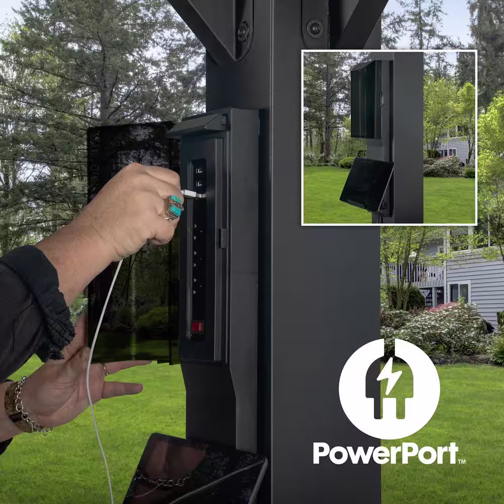 Enhance your outdoor living area with this Stonebridge pavilion gazebo. To provide superior water protection, the rainproof sloping roof is designed with a 5-degree roof pitch that prevents water from pooling. The Pro-Tect structure withstands a roof load of up to 9,800 lbs. and up to 100 MPH winds. For more durability, 29-gauge dent and corrosion-resistant steel with a thermal barrier lowers heat transfer by up to 20 degrees. PowerPort technology comes with three electrical outlets and three USB ports for outdoor power. Comes with a five-year warranty.