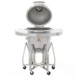 Rated Our Best Kamado Smoker for 2019 – Introducing a tough kamado grill designed to provide a lifetime of performance and memories. Made from one inch thick solid cast aluminum, the Blaze Kamado offers superior durability and outstanding temperature control. The non-porous grill body allows you to use any type of charcoal or wood, as well as any material for lighting the charcoal without worry of damaging or absorbing into the grill body. The heavy-duty 12mm hexagon, 304 stainless steel cooking grate retains heat and helps you achieve an excellent sear. The 20-inch diameter cooking grate is hinged on both sides so you can easily add wood or charcoal without completely removing the cooking surface. A mid-level 18-inch cooking grate is also included which allows you to cook closer to the fire, add a drip pan or a heat deflector for indirect cooking. If you cook food on the middle grate, you will need to use the included high heat gloves to handle the hot cooking grates. The lid hinge is made from 304 grade stainless steel and features a convenient lift assist for easy opening and closing. The Blaze Kamado grill also boasts an innovative lid seal that is superior to ceramic kamado-style grills. Instead of using a felt gasket, the cast aluminum Blaze Kamado utilizes a tongue and groove seal. This design eliminates the need to replace a damaged gasket and also provides an exceptional seal that prevents heat from escaping. The top exhaust vent is made from molded cast aluminum for precise heat control without the risk slipping out of position. The bottom of the firebox holds a removable stainless steel ash pan with handles for easy cleanup. A large temperature gauge with markings for smoking, roasting and searing temperatures is mounted in the lid, allowing you to easily monitor cooking temperatures. The stainless steel grill cart includes six casters so you can easily move the grill around on your patio or deck. The round stainless steel shelf adds valuable workspace to your grilling area but the sleek round shelf design keeps the grill from taking up too much space on your patio or deck.