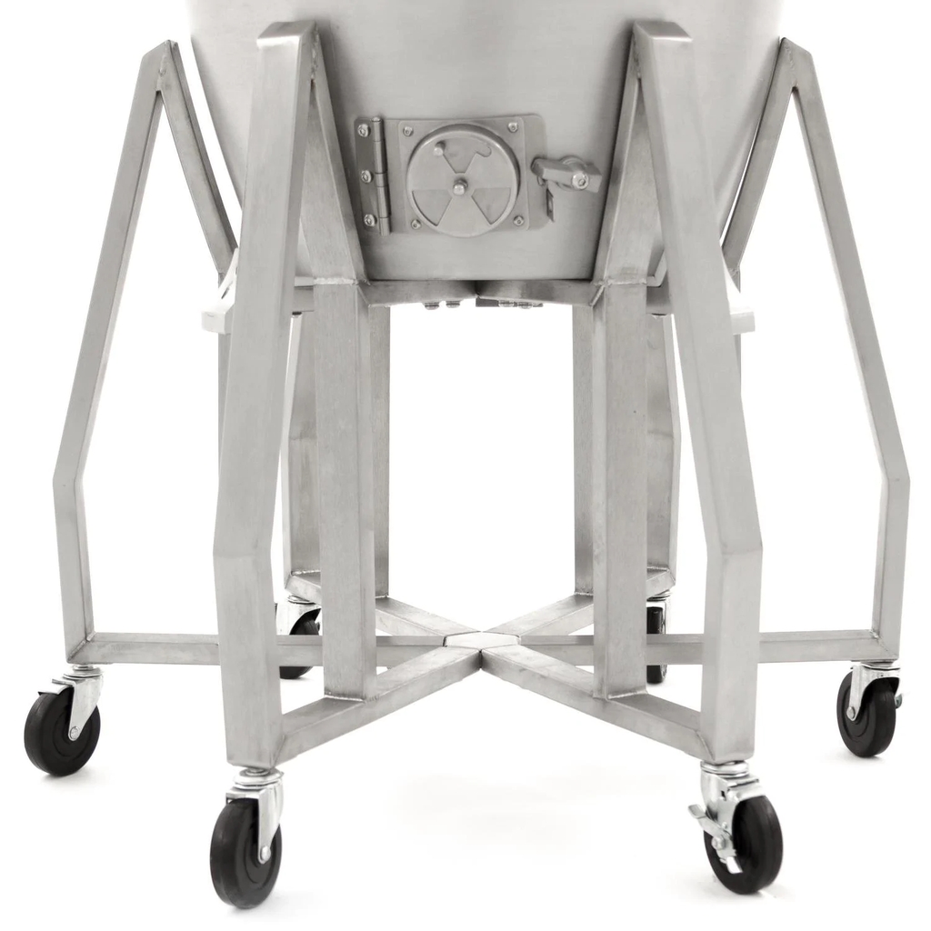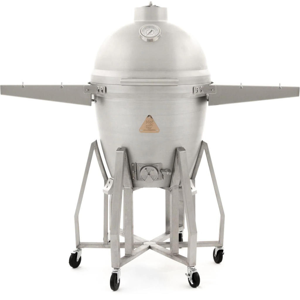 Made from one inch thick solid cast aluminum, the Blaze Kamado offers superior durability and outstanding temperature control. The non-porous grill body allows you to use any type of charcoal or wood, as well as any material for lighting the charcoal without worry of damaging or absorbing into the grill body. The heavy-duty 12mm hexagon, 304 stainless steel cooking grate retains heat and helps you achieve an excellent sear. The 20-inch diameter cooking grate is hinged on both sides so you can easily add wood or charcoal without completely removing the cooking surface. A mid-level 18-inch cooking grate is also included which allows you to cook closer to the fire, add a drip pan or a heat deflector for indirect cooking. If you cook food on the middle grate, you will need to use the included high heat gloves to handle the hot cooking grates. The lid hinge is made from 304 grade stainless steel and features a convenient lift assist for easy opening and closing. The Blaze Kamado grill also boasts an innovative lid seal that is superior to ceramic kamado-style grills. Instead of using a felt gasket, the cast aluminum Blaze Kamado utilizes a tongue and groove seal. This design eliminates the need to replace a damaged gasket and also provides an exceptional seal that prevents heat from escaping. The top exhaust vent is made from molded cast aluminum for precise heat control without the risk slipping out of position. The bottom of the firebox holds a removable stainless steel ash pan with handles for easy cleanup. A large temperature gauge with markings for smoking, roasting and searing temperatures is mounted in the lid, allowing you to easily monitor cooking temperatures. The stainless steel grill cart includes six casters so you can easily move the grill around on your patio or deck. Two stainless steel side shelves provide valuable workspace to your grilling area and four tool hooks for convenient hanging.