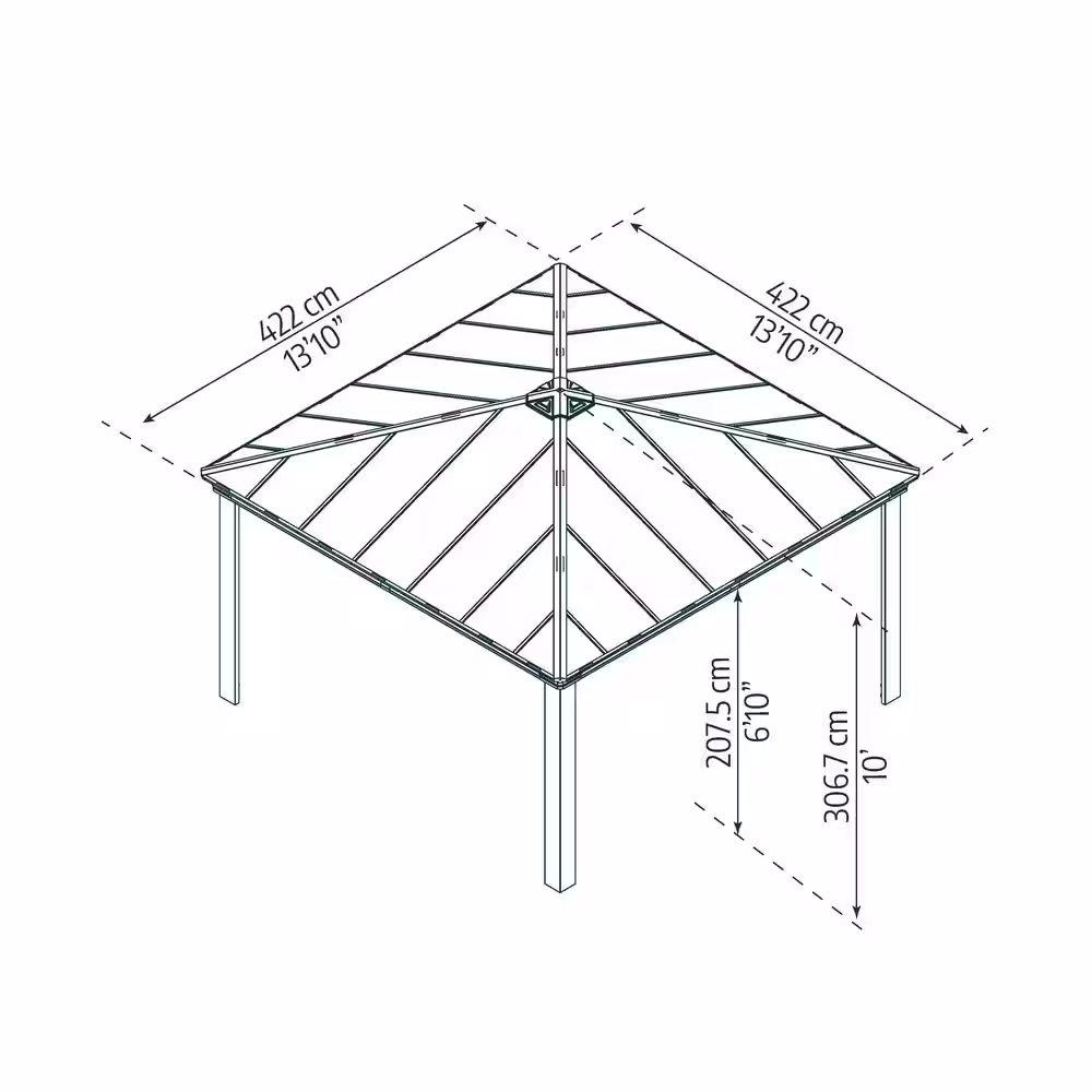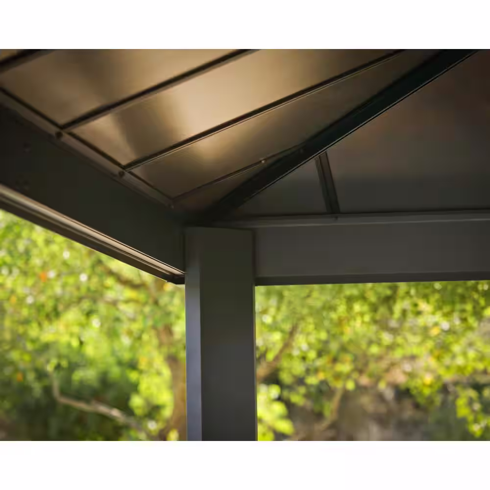 Imagine having a private getaway right in your garden or backyard. Create an entirely new quality to your yard by adding a Dallas Gazebo and turn it into the outdoor heart of your home.The extra-large Garden Living Space offers a sense of privacy and provides a shaded area you can use all year round. Add lights and a fan (sold separately) and it’s ideal for your familyget-together, hosting a barbecue bash or relaxing in your outdoor leisure spa and enjoying the fresh air and view of your garden.The hardtop gazebo has a roofing system with many advantages. It is UV-insulated tokeep you cooler on hot days, screw-free to prevent leaks, and it has built-in ventilationto keep the air flowing.This highly durable DIY Gazebo is built to last with its combination of rust-resistantpowder-coated aluminum frame and virtually unbreakable polycarbonate roof panels, protecting you from the sun’s harmful impact for many years of enjoyment.Enjoy outdoor quality living at its best!