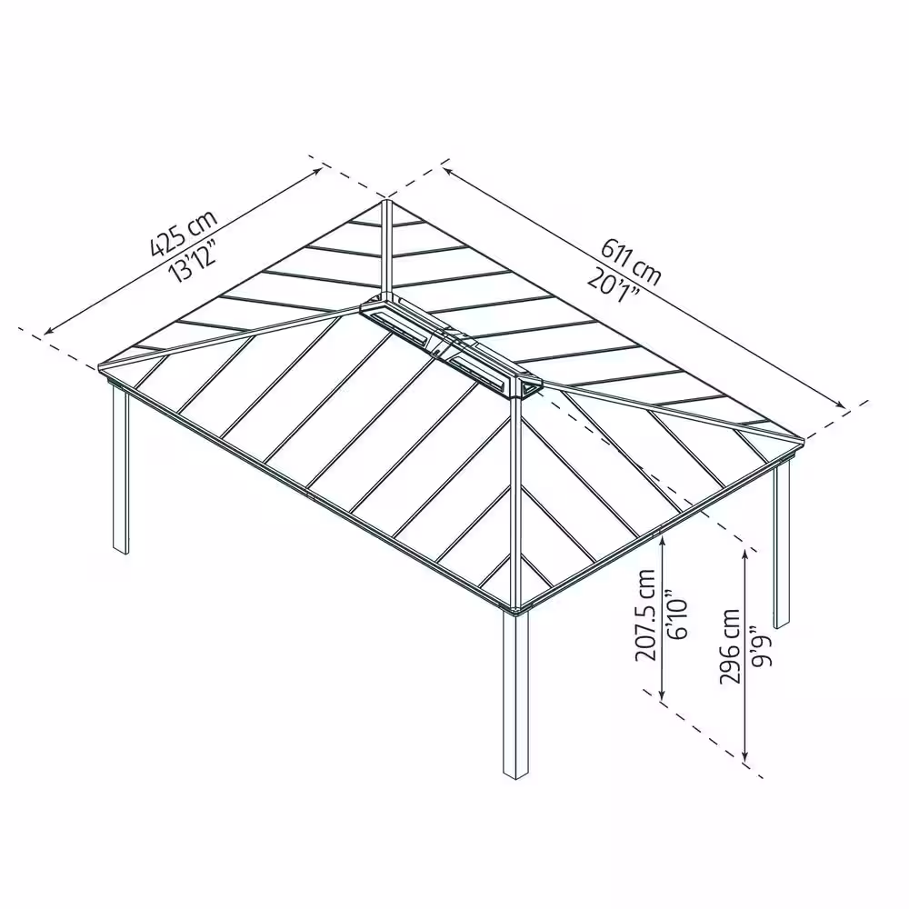 Imagine having a private getaway right in your garden or backyard. Create an entirely new quality to your yard by adding a Dallas Gazebo and turn it into the outdoor heart of your home.The extra-large Garden Living Space offers a sense of privacy and provides a shaded area you can use all year round. Add lights and a fan (sold separately) and it’s ideal for your familyget-together, hosting a barbecue bash or relaxing in your outdoor leisure spa and enjoying the fresh air and view of your garden.The hardtop gazebo has a roofing system with many advantages. It is UV-insulated tokeep you cooler on hot days, screw-free to prevent leaks, and it has built-in ventilationto keep the air flowing.This highly durable DIY Gazebo is built to last with its combination of rust-resistantpowder-coated aluminum frame and virtually unbreakable polycarbonate roof panels, protecting you from the sun’s harmful impact for many years of enjoyment.Enjoy outdoor quality living at its best!