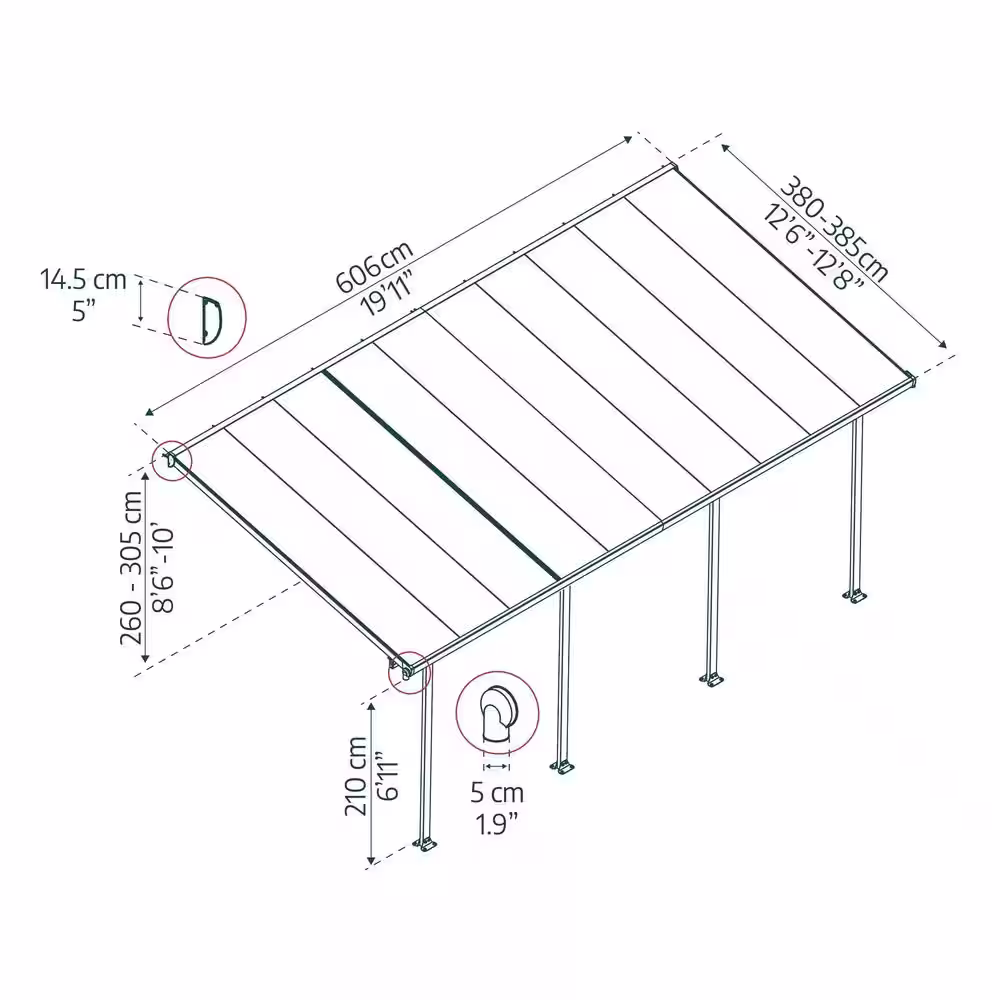Enjoy warm days, cool nights, and everything in between under the extra-wide Feria Patio Cover. The Feria Patio Cover Kit is an attractive, maintenance-free roofing solution for various outdoor uses such as a patio cover, sun lounge, and carport. Protect your valuables from unpredictable weather and harmful UV rays with this high-performance structure. It features flexible positioning poles which enable you to set your required height at the wall connection, the distance from the house and between the poles at the front. It was designed to be simply assembled by 2 people, using the Click N’ Lock roofing system for safe and simple assembly, preventing leaks. It requires no experience, no special skills, and no special tools. The Feria Patio Awning provides your family with an elegant, beautifully crafted, sturdy addition to your outside living space that is sturdy and rust-free for many years to come.
