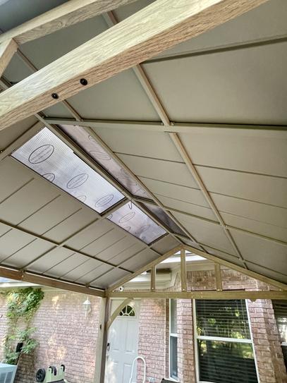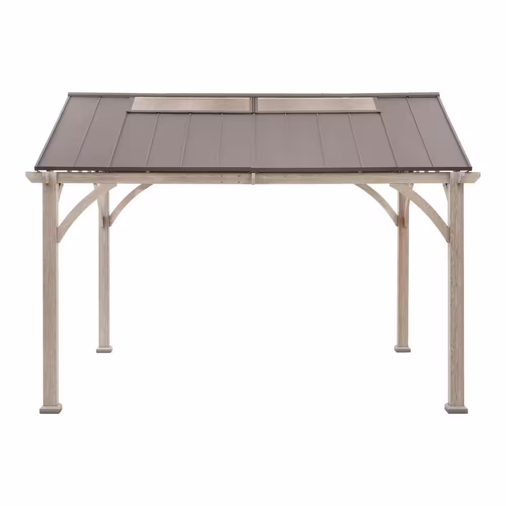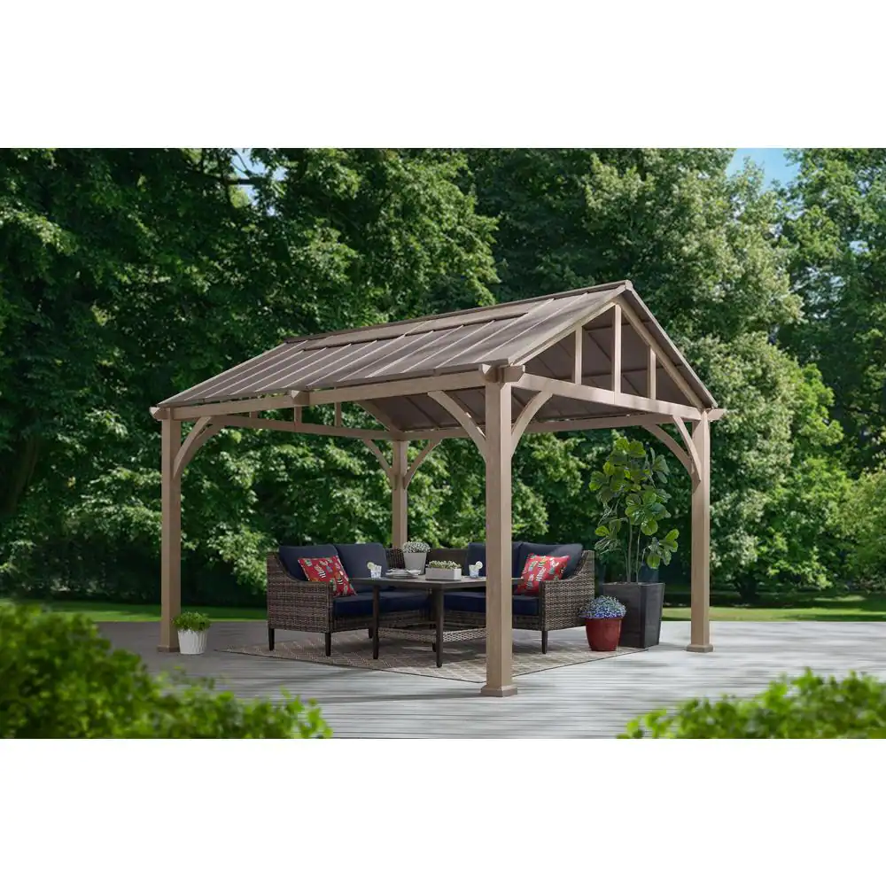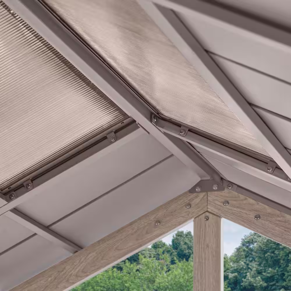 Set up a covered space for outdoor cookouts and get-togethers with this Hampton Bay Lindmoore taupe pitched roof hard top gazebo. The rust-resistant steel frame has a powder coating for protection against the sun and rain, while the galvanized steel roof bears up against changing weather and temperatures. A polycarbonate skylite allows natural light to filter through, minimizing the need for more artificial lighting. This Hampton Bay Lindmoore taupe pitched roof hard top gazebo has a snow load capacity of 2,680 lbs. and heavy-duty 4.7-inch steel posts for reliable strength.