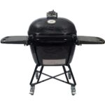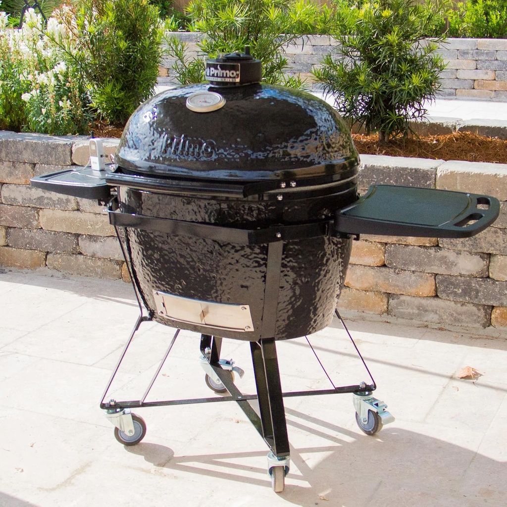 Choose Primo and experience the best in kamado style charcoal cooking. The Primo All-In-One Oval XL Ceramic Kamado Grill With Cradle & Side Shelves is an extra-large sized grill and one of the biggest ceramic cookers on the market. The distinct shape of the Oval XL allows you to cook using direct or indirect heat, expanding your grilling options unlike any other kamado-style grill. This grill features easy to clean and reversible porcelain-coated cooking grates, as well as one of the highest sitting lids which is great for cooking whole chickens or turkeys. This kamado style grill is made in the USA, unlike its competition, and constructed with premium grade Primo SuperCeramics and coated with a protective, lead-free, and scratch-resistant porcelain glaze. The patented Primo Oval XL efficiently retains and evenly distributes heat across the 400 square inches of cooking surface, perfect for maintaining a consistent temperature. Smoke meat at temperatures as low as 180 degrees Fahrenheit, or turn up the heat to more than 500 degrees Fahrenheit for searing and grilling. Use the cast iron chimney cap, stainless steel lower vent door, and easy to read thermometer for monitoring and keeping a precise temperature. The easy lift-and-lock hinge system keeps the lid raised in place, and the soft-close felt gasket protects the ceramic while opening and closing the lid using the cool touch handle. Heat-safe ceramic feet are available to stabilize your Primo and are needed when the grill sits on a combustible surface (sold separately). The variety of accessories available, along with the unique oval shape, allows flexibility in cooking a never ending list of delicious meals. Choosing a Primo kamado style grill is a decision you will never regret. The sturdy metal cradle securely holds your Primo Oval XL Ceramic Kamado Grill and is the ideal cart for a small yard or patio. Four revolving wheels help you move it around with ease, and two wheels can be locked for stability while grilling. Side shelves made with FDA approved material for food contact, ash tool and grill lifter are all included in this package.