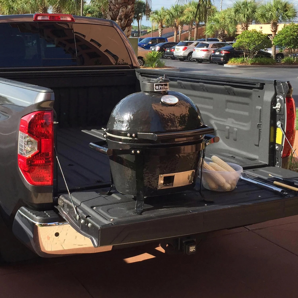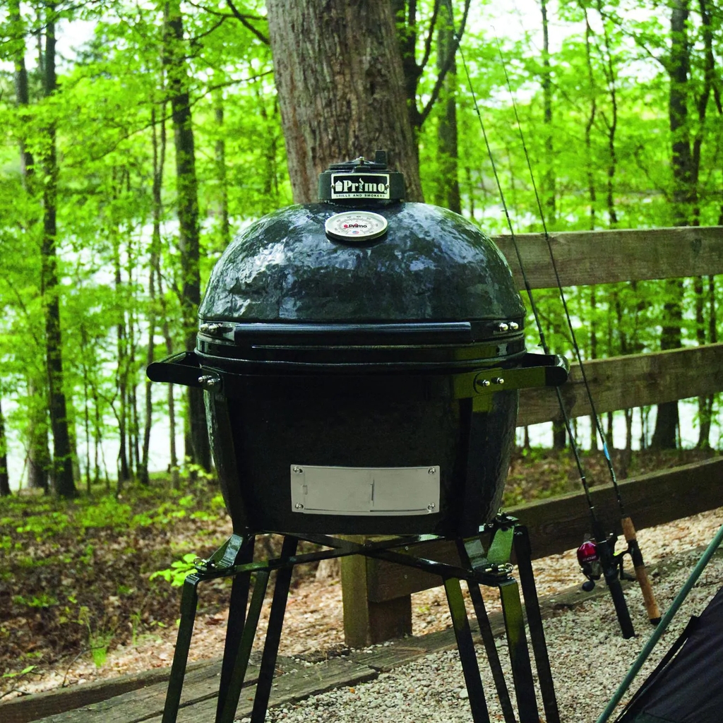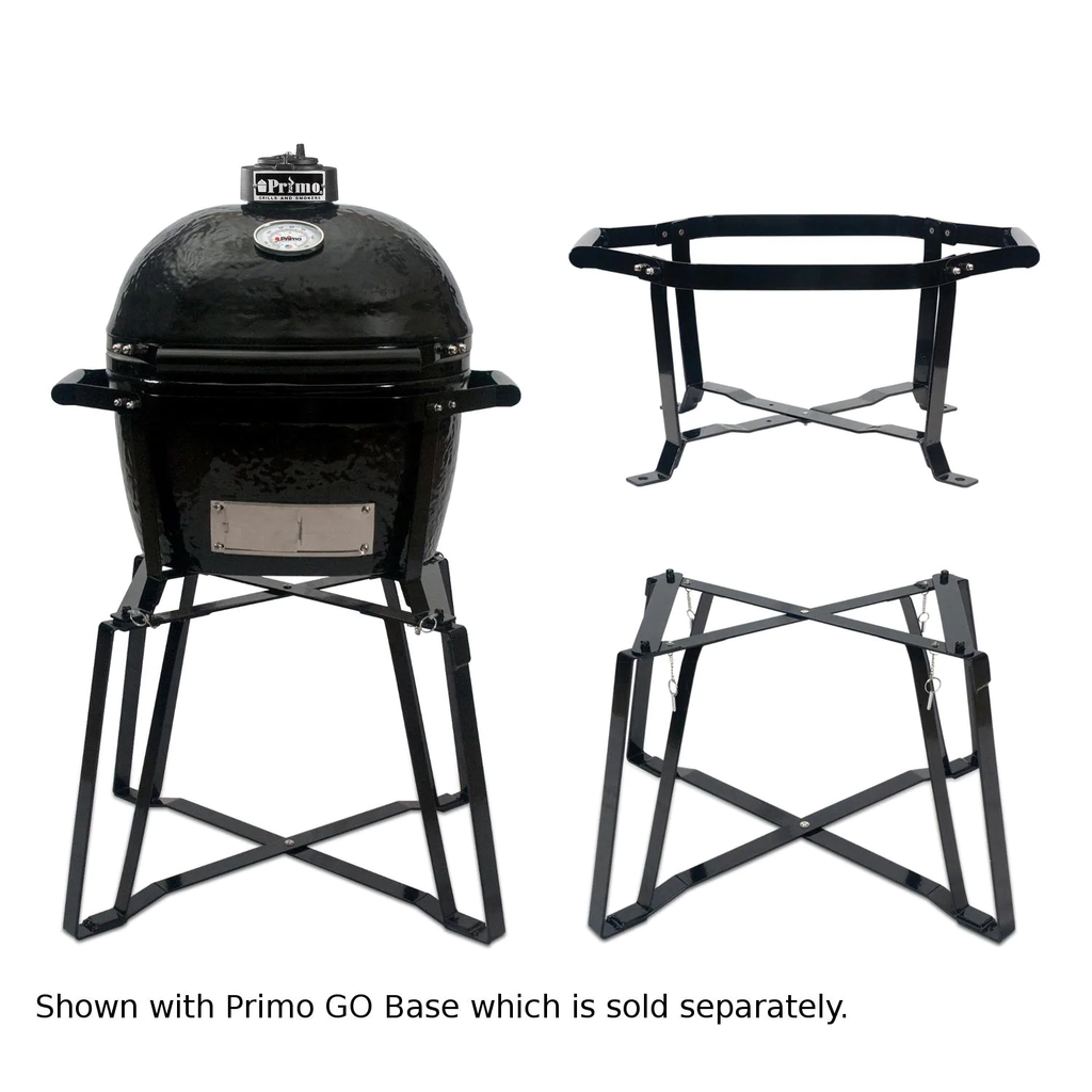 Choose Primo and experience the best in kamado style charcoal cooking. The Primo Oval Junior Smoker Charcoal Grill is a medium to large size grill with all the benefits of the original, uniquely shaped Oval XL, but for those who do not need as much cooking area. The distinct shape of the Oval Junior allows you to cook using direct or indirect heat, expanding your grilling options unlike any other kamado-style grill. This grill features easy to clean and reversible porcelain-coated cooking grates, as well as one of the highest sitting lids on the market which is great for cooking whole chickens. This kamado style grill is made in the USA, unlike its competition, constructed with premium grade Primo SuperCeramics, and coated with a protective, lead-free, and scratch-resistant porcelain glaze. The patented Primo Oval Junior efficiently retains and evenly distributes heat across the 210 square inches of cooking surface, perfect for maintaining a consistent temperature. Smoke meat at temperatures as low as 180 degrees Fahrenheit, or turn up the heat to more than 500 degrees Fahrenheit for searing and grilling. Use the cast iron chimney cap, stainless steel lower vent door, and easy to read thermometer for monitoring and keeping a precise temperature. The easy lift-and-lock hinge system keeps the lid raised in place, and the soft-close felt gasket protects the ceramic while opening and closing the lid using the cool touch handle. The Primo Oval Junior on GO portable carrier is the largest portable ceramic grill available. Pair it with the GO Base and it becomes a two-piece cradle that offers maximum portability and at home use without the need for a grill table or cart. With the sturdy handles of the Primo GO portable carrier and a friend and the Primo Oval Junior can easily be taken to a tailgate, camping or on a picnic. The variety of accessories available, along with the unique oval shape, allows flexibility in cooking a never ending list of delicious meals. Choosing a Primo kamado style grill is a decision you will never regret.