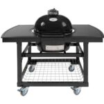 Choose Primo and experience the best in kamado style charcoal cooking. The Primo Oval Junior Smoker Charcoal Grill is a medium to large size grill with all the benefits of the original, uniquely shaped Oval XL, but for those who do not need as much cooking area. The distinct shape of the Oval Junior allows you to cook using direct or indirect heat, expanding your grilling options unlike any other kamado-style grill. This grill features easy to clean and reversible porcelain-coated cooking grates, as well as one of the highest sitting lids on the market which is great for cooking whole chickens. This kamado style grill is made in the USA, unlike its competition, constructed with premium grade Primo SuperCeramics, and coated with a protective, lead-free, and scratch-resistant porcelain glaze. The patented Primo Oval Junior efficiently retains and evenly distributes heat across the 210 square inches of cooking surface, perfect for maintaining a consistent temperature. Smoke meat at temperatures as low as 180 degrees Fahrenheit, or turn up the heat to more than 500 degrees Fahrenheit for searing and grilling. Use the cast iron chimney cap, stainless steel lower vent door, and easy to read thermometer for monitoring and keeping a precise temperature. The easy lift-and-lock hinge system keeps the lid raised in place, and the soft-close felt gasket protects the ceramic while opening and closing the lid using the cool touch handle. The powder-coated steel cart with side shelves made from high quality marine grade HDPE materials resists rusting and the wire basket is perfect for storing charcoal or other accessories. The side tables extend your work area, allowing you to keep ingredients nearby. Four heavy-duty swivel casters roll smoothly on any patio surface and lock in place when you are ready to grill. The variety of accessories available, along with the unique oval shape, allows flexibility in cooking a never ending list of delicious meals. Choosing a Primo kamado style grill is a decision you will never regret.