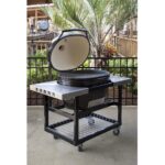 Choose Primo and experience the best in kamado style charcoal cooking. The Primo Oval Junior Smoker Charcoal Grill is a medium to large size grill with all the benefits of the original, uniquely shaped Oval XL, but for those who do not need as much cooking area. The distinct shape of the Oval Junior allows you to cook using direct or indirect heat, expanding your grilling options unlike any other kamado-style grill. This grill features easy to clean and reversible porcelain-coated cooking grates, as well as one of the highest sitting lids on the market which is great for cooking whole chickens. This kamado style grill is made in the USA, unlike its competition, constructed with premium grade Primo SuperCeramics, and coated with a protective, lead-free, and scratch-resistant porcelain glaze. The patented Primo Oval Junior efficiently retains and evenly distributes heat across the 210 square inches of cooking surface, perfect for maintaining a consistent temperature. Smoke meat at temperatures as low as 180 degrees Fahrenheit, or turn up the heat to more than 500 degrees Fahrenheit for searing and grilling. Use the cast iron chimney cap, stainless steel lower vent door, and easy to read thermometer for monitoring and keeping a precise temperature. The easy lift-and-lock hinge system keeps the lid raised in place, and the soft-close felt gasket protects the ceramic while opening and closing the lid using the cool touch handle. The powder-coated steel cart with stainless steel side shelves resists rusting, and the wire basket is perfect for storing charcoal or other accessories. The side tables extend your work area, allowing you to keep ingredients nearby and the hooks on each shelf provide storage for grilling tools. Four heavy-duty swivel casters roll smoothly on any patio surface and lock in place when you are ready to grill. The variety of accessories available, along with the unique oval shape, allows flexibility in cooking a never ending list of delicious meals. Choosing a Primo kamado style grill is a decision you will never regret.