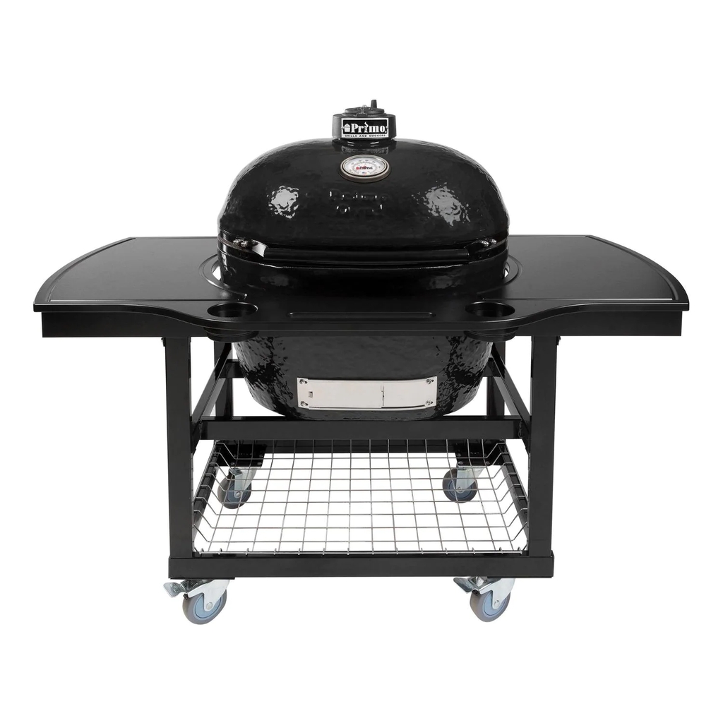 Choose Primo and experience the best in kamado style charcoal cooking. The Primo Oval XL Charcoal Smoker Grill is an extra large sized grill and one of the biggest ceramic cookers on the market. The distinct shape of the Oval XL allows you to cook using direct or indirect heat, expanding your grilling options unlike any other kamado-style grill. This grill features easy to clean and reversible porcelain-coated cooking grates, as well as one of the highest sitting lids which is great for cooking whole chickens or turkeys. This kamado style grill is made in the USA, unlike its competition, and constructed with premium grade Primo SuperCeramics and coated with a protective, lead-free, and scratch-resistant porcelain glaze. The patented Primo Oval XL efficiently retains and evenly distributes heat across the 400 square inches of cooking surface, perfect for maintaining a consistent temperature. Smoke meat at temperatures as low as 180 degrees Fahrenheit, or turn up the heat to more than 500 degrees Fahrenheit for searing and grilling. Use the cast iron chimney cap, stainless steel lower vent door, and easy to read thermometer for monitoring and keeping a precise temperature. The easy lift-and-lock hinge system keeps the lid raised in place, and the soft-close felt gasket protects the ceramic while opening and closing the lid using the cool touch handle. The powder-coated steel cart with side shelves made from high quality marine grade HDPE materials resists rusting and the wire basket is perfect for storing charcoal or other accessories. The side tables extend your work area, allowing you to keep ingredients nearby and offer two cup holders for keeping drinks nearby. Four heavy-duty swivel casters roll smoothly on any patio surface and lock in place when you are ready to grill. The variety of accessories available, along with the unique oval shape, allows flexibility in cooking a never ending list of delicious meals. Choosing a Primo kamado style grill is a decision you will never regret.