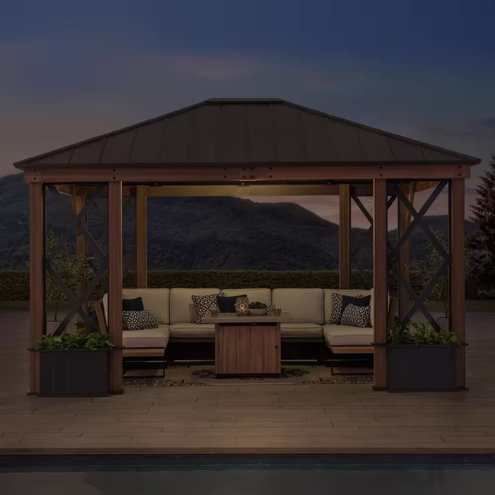 Expand your living space by bringing the indoors outside and create an end-of-the-day oasis that’s the perfect spot for entertaining family and friends. Create the perfect outdoor setting for any time of the year. Spend all four seasons enjoying a covered spot outdoors under the natural wood-looking hardtop gazebo made of rust-proof aluminum frame and galvanized steel roof. The four built-in aluminum planters are the perfect place to add greenery or florals during warmer months for color. Use them to hold dried corn stalks or wheat bundles for some autumnal decor. Set the mood by suspending a chandelier from the incorporated ceiling hook for additional functional light and high design. With straightforward, easy-to-follow assembly instructions you’ll soon be relaxing in your favorite new outdoor living space, and for years to come.