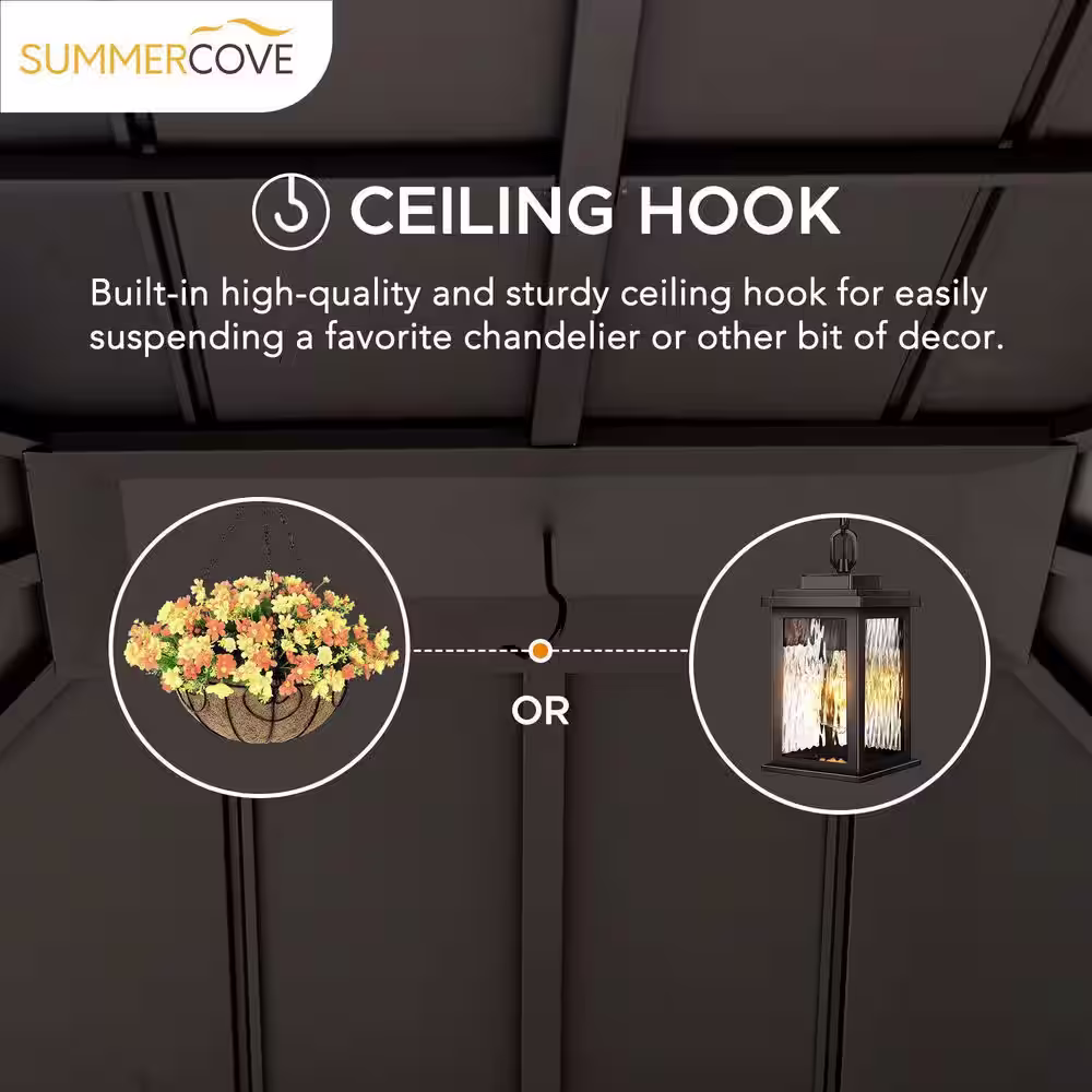 - Light Up Your Outdoor Patio:This metal gazebo is provided with a ceiling hook for suspending lighting (not included) to illuminate your outdoor evening gatherings.