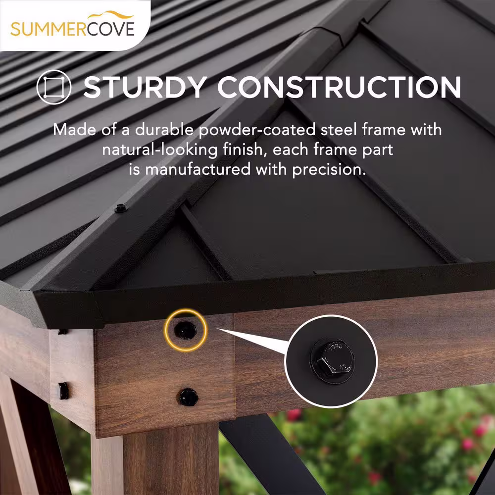 - Rust-resistant Aluminum Frame: With a rust-resistant aluminum frame and galvanized steel roof, this hardtop gazebo is durable and sturdy. These posts feature a natural wood grain finish to add cozy style to your outdoor conversation area, perfect for many seasons to come.