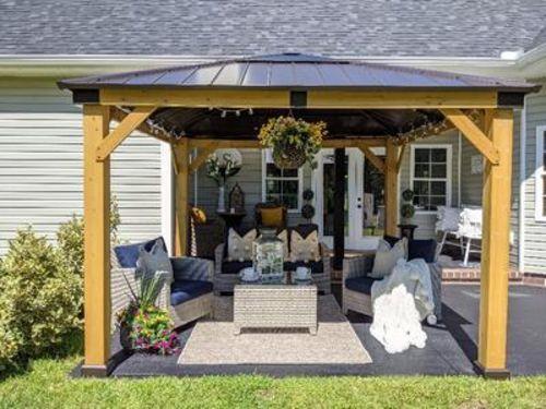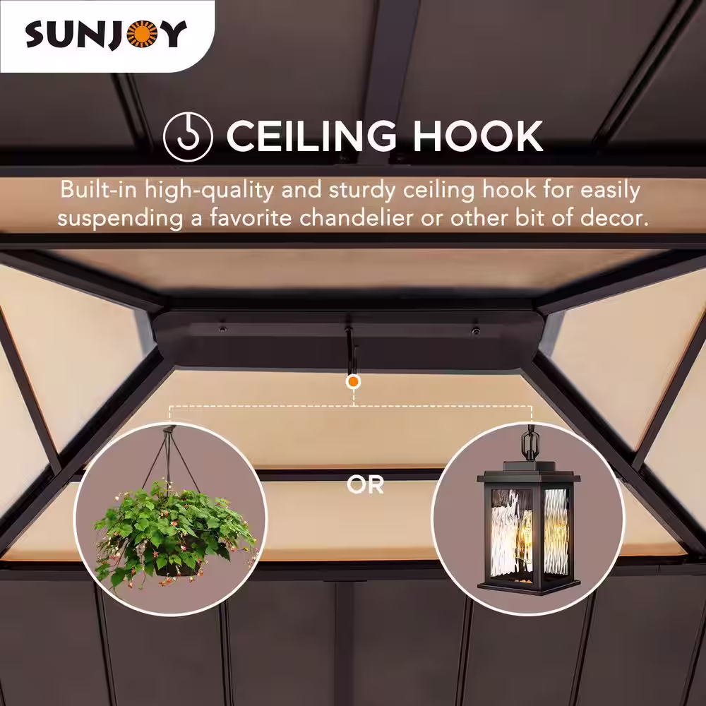 Expand your living space by bringing the indoors outside and create your end-of-the-day oasis that’s the perfect spot for entertaining family and friends. This 11 ft. x 13 ft. gazebo by the world’s leading ready-to-assemble outdoor structure maker, Sunjoy, creates the perfect outdoor setting for any time of the year. Spend all four seasons enjoying a covered spot outdoors beneath a cedar wood frame and sturdy, rust-resistant, powder-coated steel and polycarbonate roof top that will stand the test of time. The polycarbonate skylight allows the gazebo to provide needed shade on hot sunny days while still allowing in natural light. Set the mood by suspending a chandelier from the incorporated ceiling hook for additional functional light and a touch of elegance. With straight-forward, easy-to-follow assembly instructions you’ll soon be enjoying your favorite new outdoor living space, and for years to come.