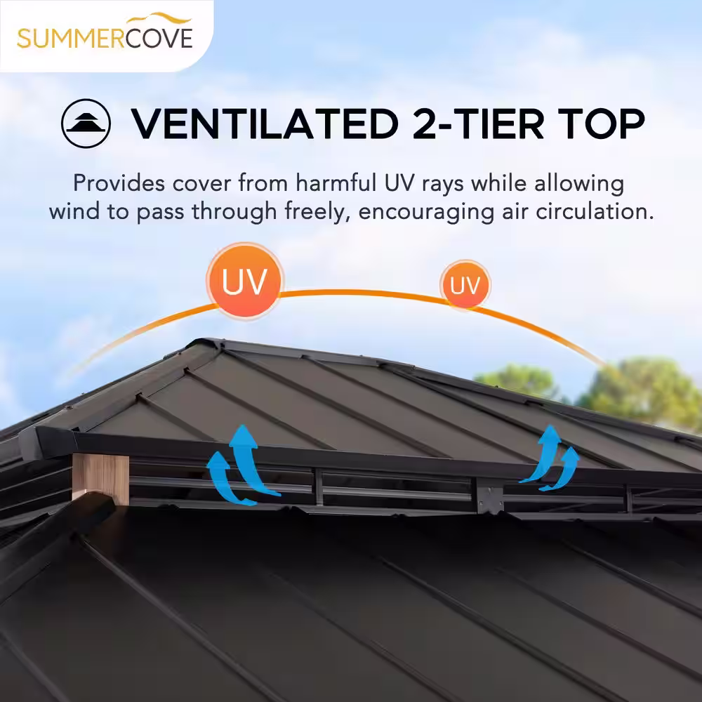 Create an outdoor gathering spot for family and friends away from the glaring sun. This 13 ft. x 15 ft. 2-tier roof gazebo by the world’s leading ready-to-assemble outdoor structure maker, SummerCove, creates a perfect outdoor gathering spot for any time of the year. Keep cool in the shade under the durable steel roof and frame. With straight-forward, easy-to-follow assembly instructions you’ll be relaxing in your favorite new outdoor living space in no time.