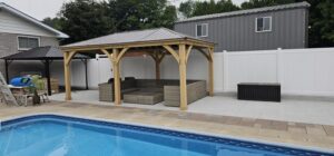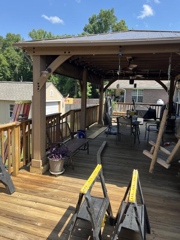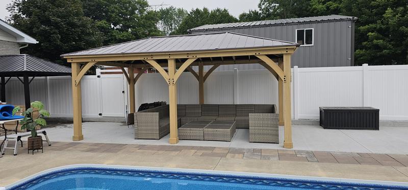 Transform your outdoor living space with the 12 x 20 Meridian Gazebo.Built using 100% cedar, and finished in a natural cedar stain, the 12′ x 20′ Meridian will add instant character to any yard! This stylish and peaceful oasis will leave family and friends feeling welcome and relaxed. The striking design features a coffee brown aluminum roof which will provide you and your guests plenty of shade for years to come!The spacious 12′ x 20′ Meridian Gazebo is big enough to set up both a dining – and living space. Strong and sturdy construction means the Gazebo can be attached to any structurally safe surface. Your new gazebo is designed for stress-free assembly! The wood comes pre-cut and pre-drilled, so all parts fit together with easeThe 12′ x 20′ Meridian Gazebo is a sophisticated and beautiful escape that will add a stylish and modern look to your outdoor living space!